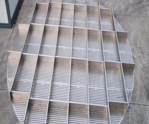 脫硫塔、噴淋塔、冷卻塔、濕電除塵等脫硫脫銷除塵設備煙氣均布裝置,材質一般有304,316L,2205,2507,1.4529,C-276等,厚度2-4mm,通孔率35-45%,圓孔直徑一般35mm,托盤的大小根據塔體的直徑變化,合金托盤整套設備包含:托盤主體,抱箍,夾板,定矩管,螺栓組件等。一般裝在脫硫脫銷設備下氣室,高度根據塔大小確定。